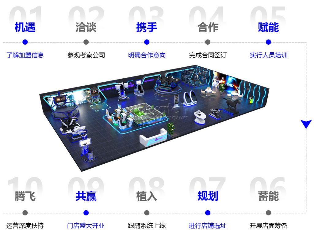 根據場地大小,投資成本,周邊的人流量分析,消費水平及喜好等,vr設備按坪效,人氣, 粘度科學組合,從0開始幫助加盟商建立一站式vr主題樂園,實現多元盈利